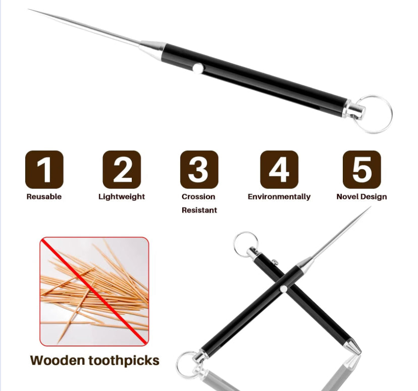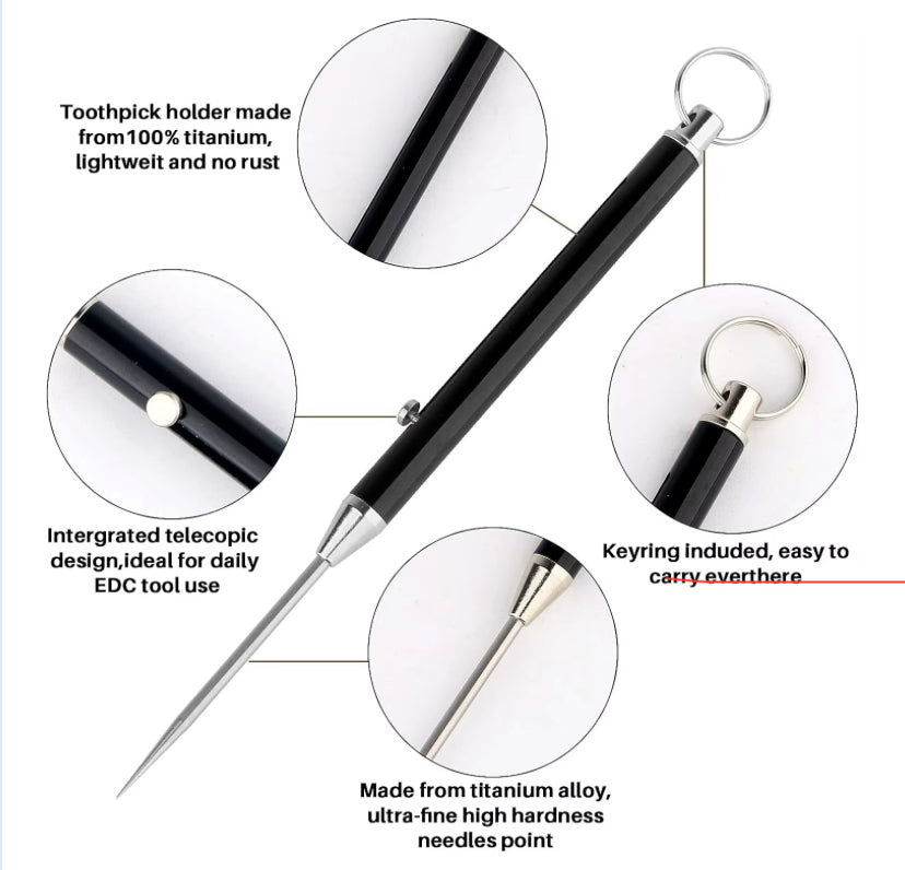 Elevate your everyday carry with our Black Titanium Alloy EDC Telescopic Toothpick Keychain Pendant. This sleek and durable tool is perfect for camping, picnics, or simply enjoying your favorite fruits on the go. Its compact design allows for easy storage, while the telescopic feature ensures you always have a clean toothpick at hand. Made from high-quality titanium alloy, this toothpick holder is not only stylish but also built to last. Make it a thoughtful gift for outdoor enthusiasts or treat yourself to this essential accessory today! -Material: Titanium alloy -Size: One size -Color: One color